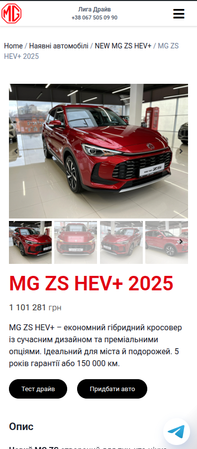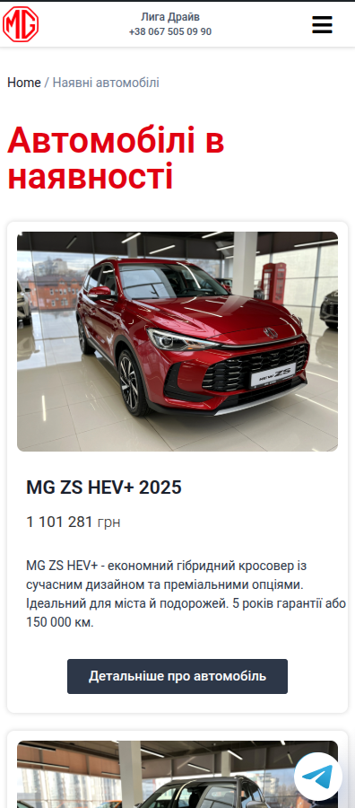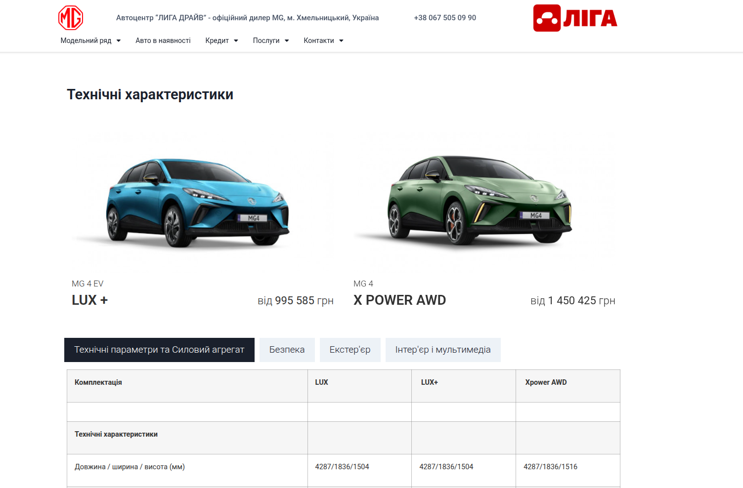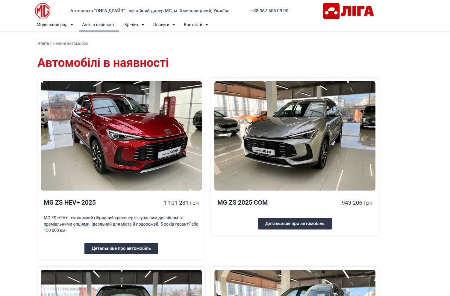 Особливу увагу приділили візуальній частині — дизайн відображає преміальність бренду MG та атмосферу автоцентру “ЛИГА ДРАЙВ”. Користувач легко знаходить потрібні моделі, переглядає технічні характеристики, порівнює авто та отримує всю інформацію про послуги дилера.