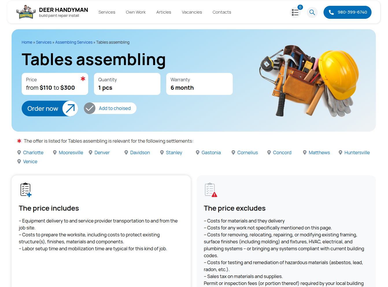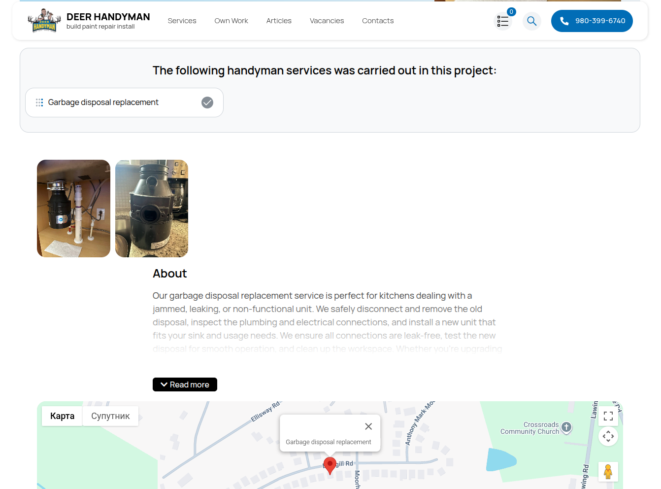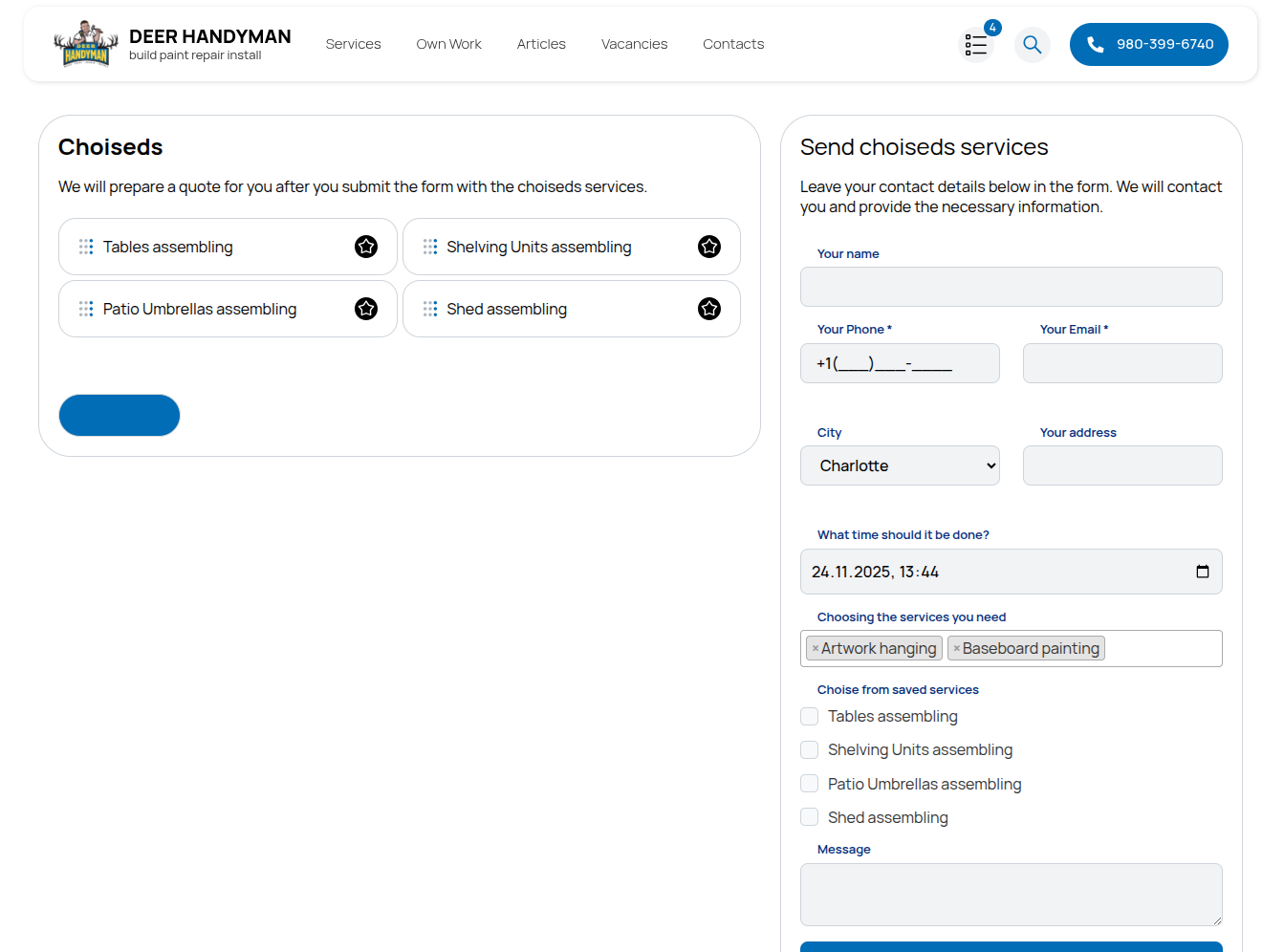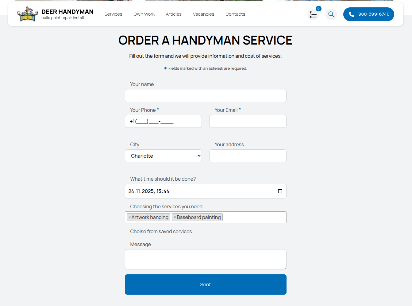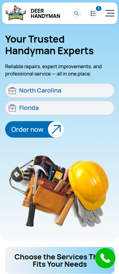 Deer Handyman Office — це зручний сервісний сайт для компанії, що надає послуги різноробочих у Північній Кароліні. Основною метою проєкту було створити платформу, де клієнти можуть швидко знайти потрібну послугу, ознайомитися з цінами, побачити приклади виконаних робіт та одразу оформити замовлення.