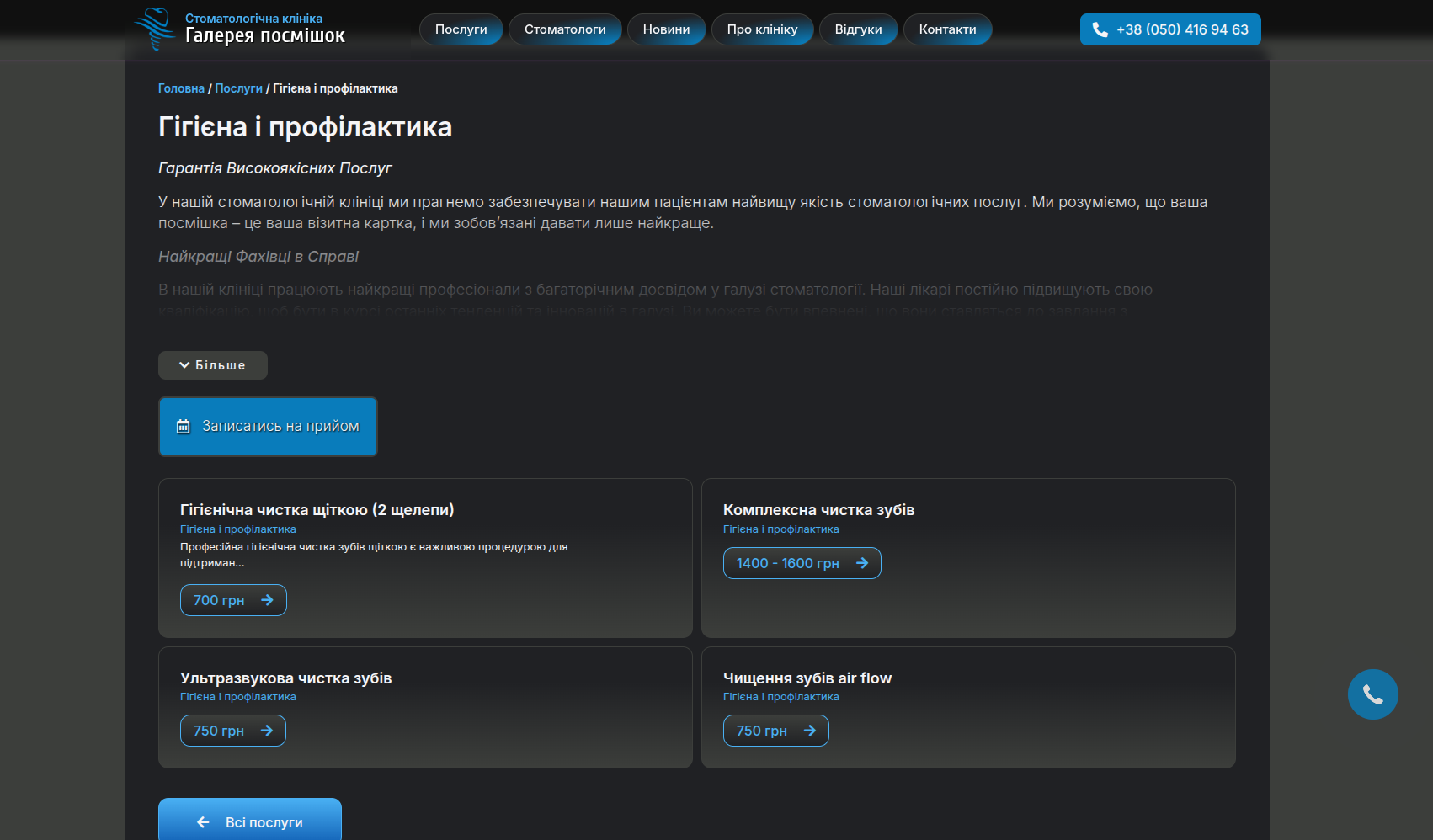 ✅ Зрозумілу навігацію за напрямками стоматології (лікування, гігієна, протезування, ортодонтія)
