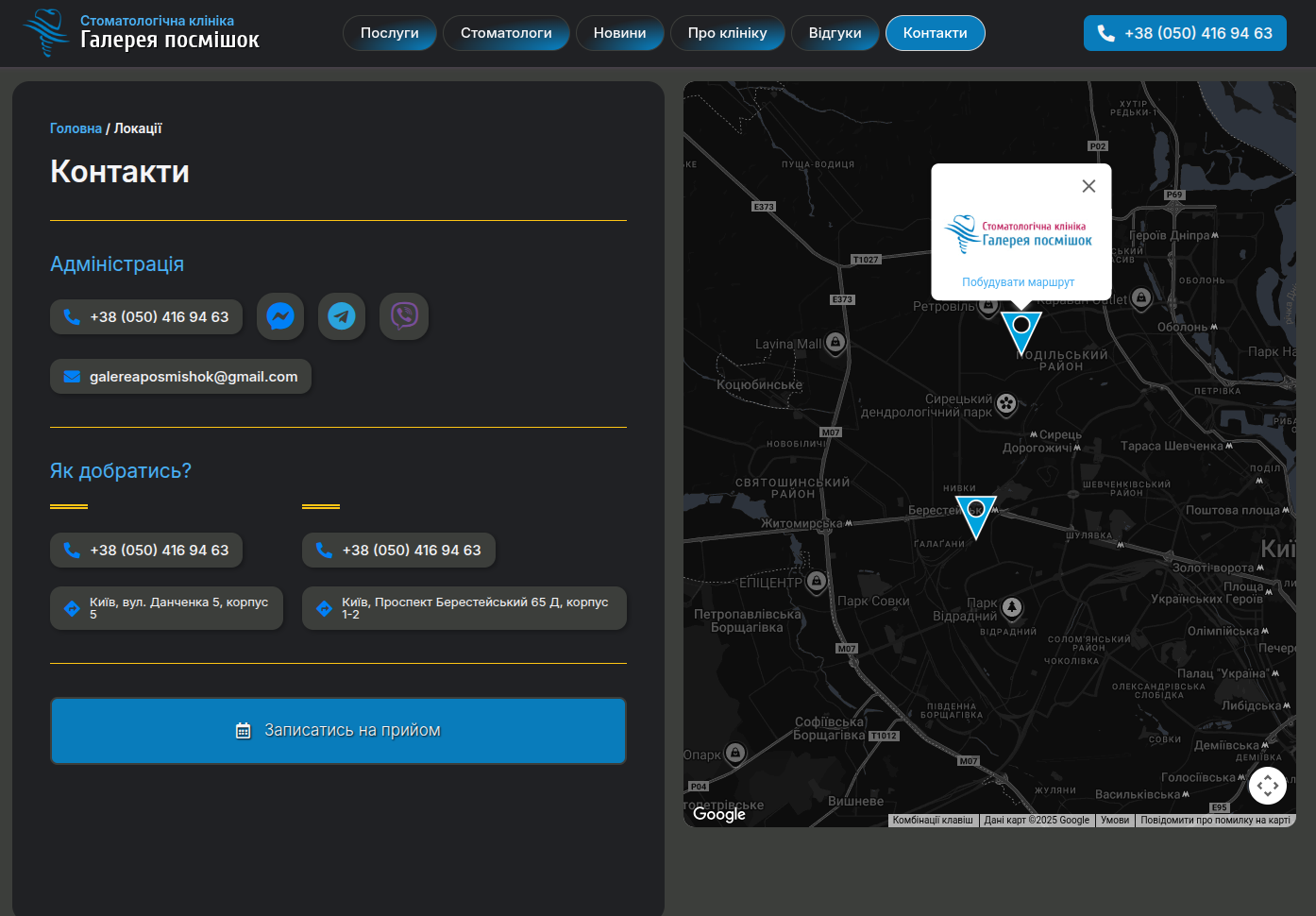 Ми розробили сучасний та зручний вебсайт для приватної стоматологічної клініки «Галерея посмішок», який спрощує запис на прийом і презентує клініку як професійний медичний центр із високим рівнем сервісу.